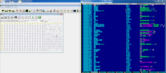 Left: Using RW everything tool to check the HDD sectors (currently displaying sector 1) Right: Using hiew32.exe disassembly tool to offset into 400h which is beginning of code segment of EXP.EXE