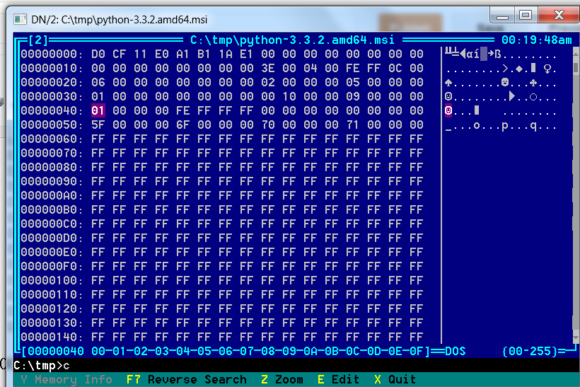 00000100: 50 59 54 48 4F 4E 7E 31-4D 53 49 20 00 B6 D8 61  *PYTHON.1MSI ...a*